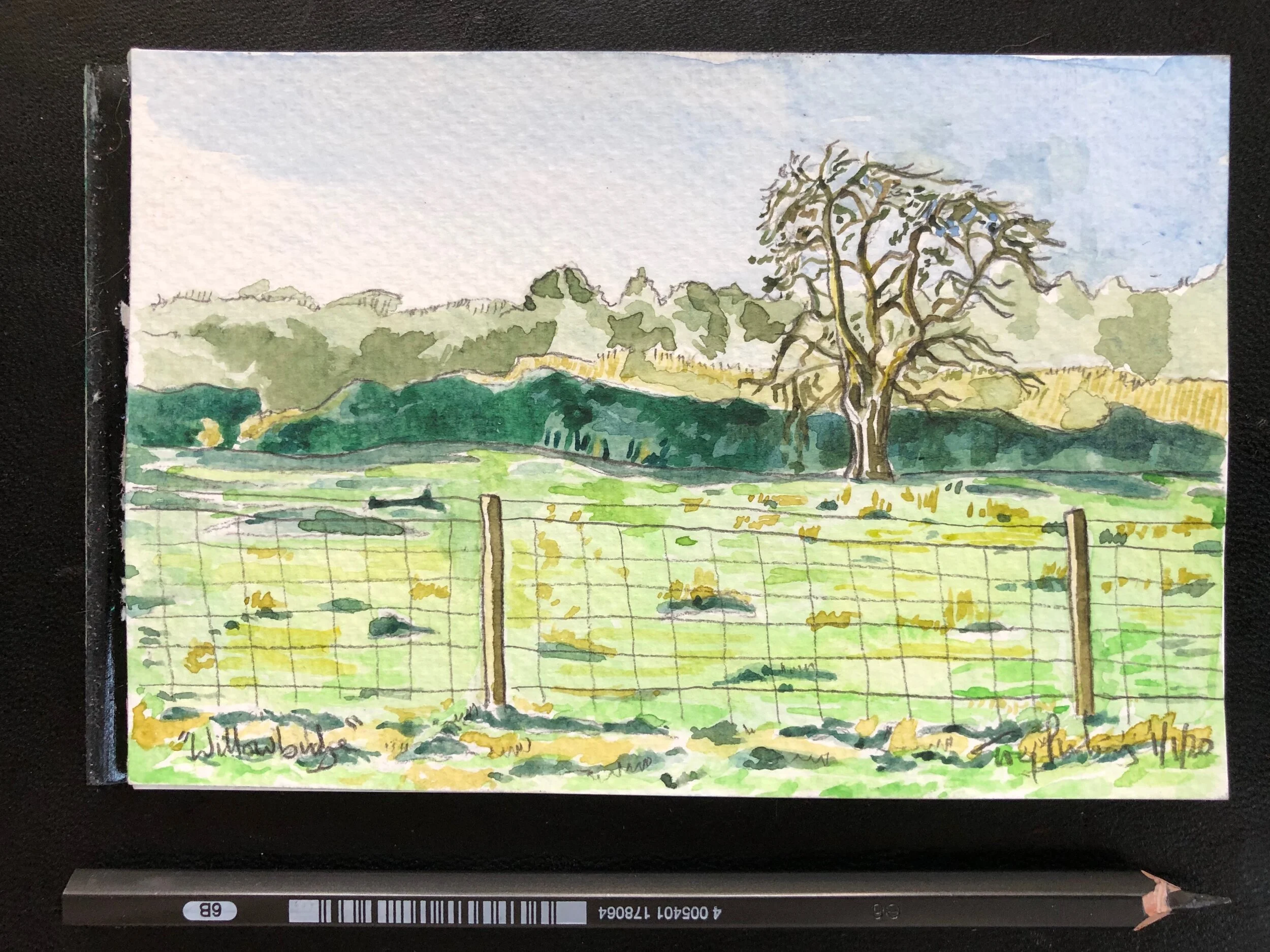 Deciding that overthinking was the problem I decided on simplicity (partly through a visit to see Dad and connect through drawing animals that mean a lot to him), to take time to properly look. Being away from urban spaces, and having spent much of the last couple of months lost in them anyway, I went for watercolour sketches of nature – specifically animals and the countryside. As I was moving around, these sketches are all postcard size, and painted with a traveling watercolour palette [fig: 1-4].