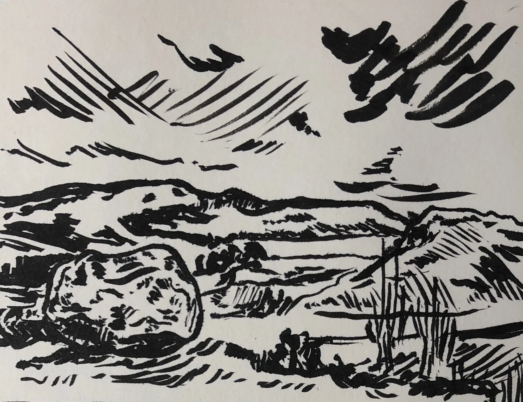 I wandered along the street getting my bearings. I find walking helps me make decisions, the activity engages my more decisive subconscious, which tells me important things I hadn’t considered – in this case that I wanted to dump a load of my stuff. Suitably chastised I headed over to my B & B. Offered the choice of a view of Ben Ledi and a shower across the hall, or an en-suite with a view of the road outside, I predictably plumped for the view. After unpacking quickly, I settled to draw the view for the first of many times [fig.1]. Anxious to get a first impression I opted for brush pen to force me to look and to find the line of the mountain. With mist and snow blurring the summit I realised that what was important, using ink, was the negative space – and how the white of the paper could be more eloquent than the mark of the brush.